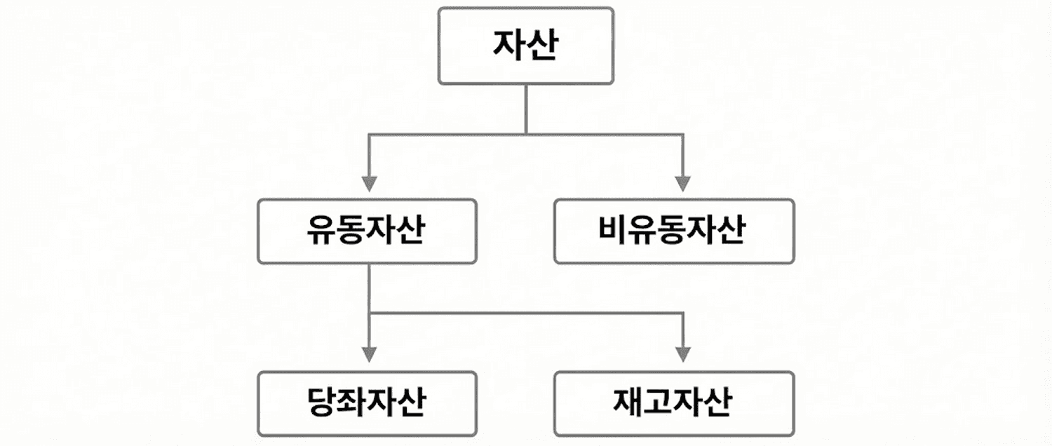 자산은 현금화 속도에 따라 유동자산(1년 이내)과 비유동자산(1년 초과)으로 구분됩니다. 유동자산은 다시 판매 과정의 필요 여부에 따라 당좌자산(판매 불필요)과 재고자산(판매 필수)으로 세분화됩니다.