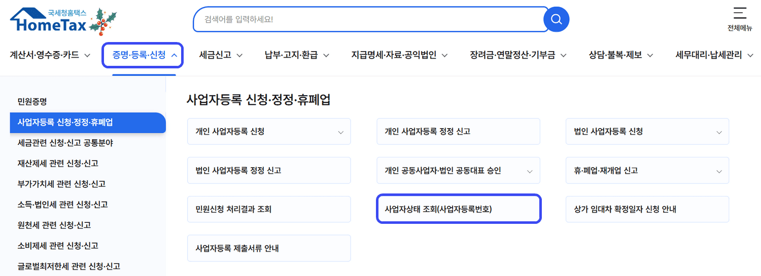 경로: 상단 메뉴 [증명·등록·신청] > [사업자등록 신청·정정·휴폐업] > [사업자상태 조회]