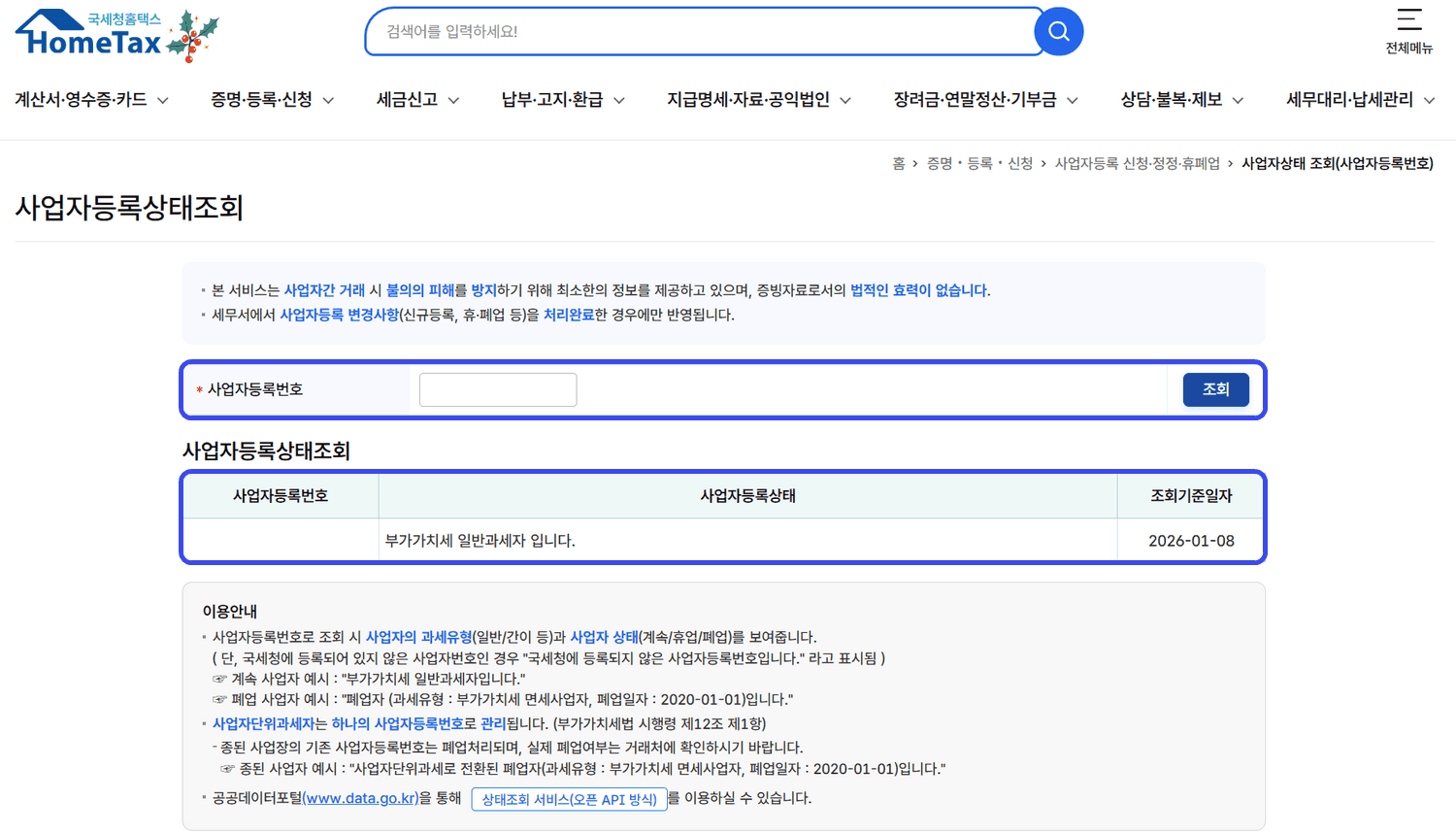 바로가기: 홈택스 사업자등상태 조회 페이지