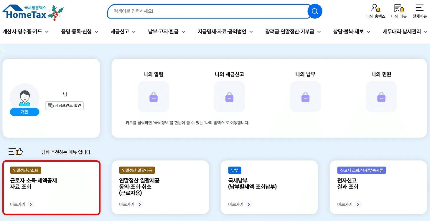 로그인 후 메인화면 하단의 [근로자 소득·세액공제 자료 조회] 바로가기 메뉴를 클릭합니다.