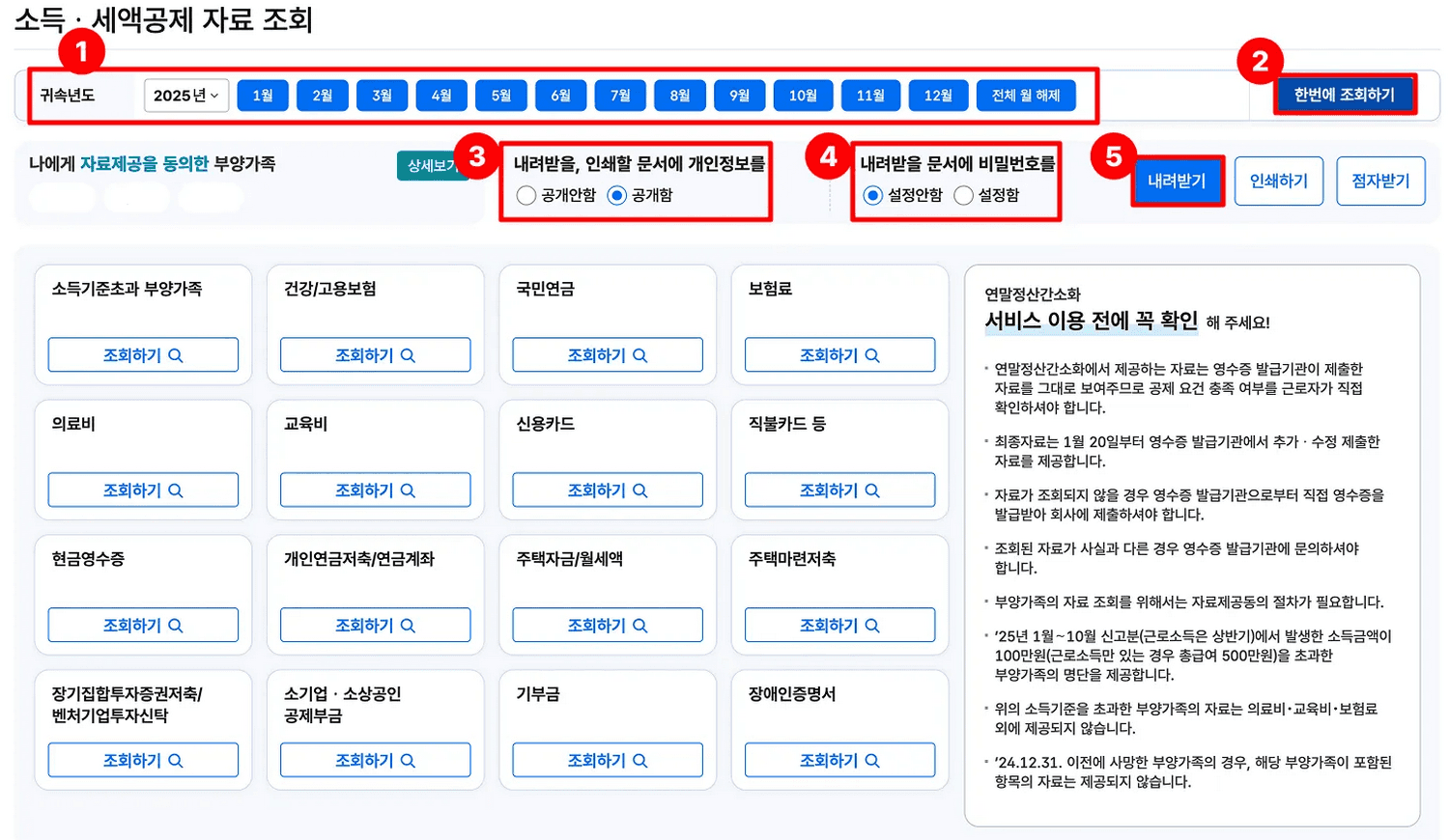 ⚠️ 공제 요건을 충족하지 않는 가족의 지출액은 공제 대상에서 제외됩니다. 따라서, 공제되지 않는 지출액만 있는 경우라면 부양가족의 자료를 별도로 다운로드하실 필요가 없습니다.
