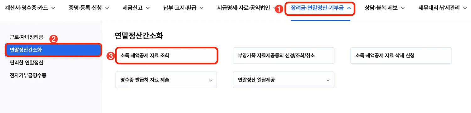 상단 메뉴에서 [장려금·연말정산·기부금] → [연말정산간소화] → [소득·세액공제 자료 조회] 순서로 이동하시면 됩니다.