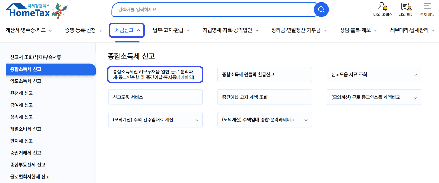 경로: 상단 메뉴 [세금신고] > [종합소득세 신고] > [종합소득세신고(모두채움 등)]