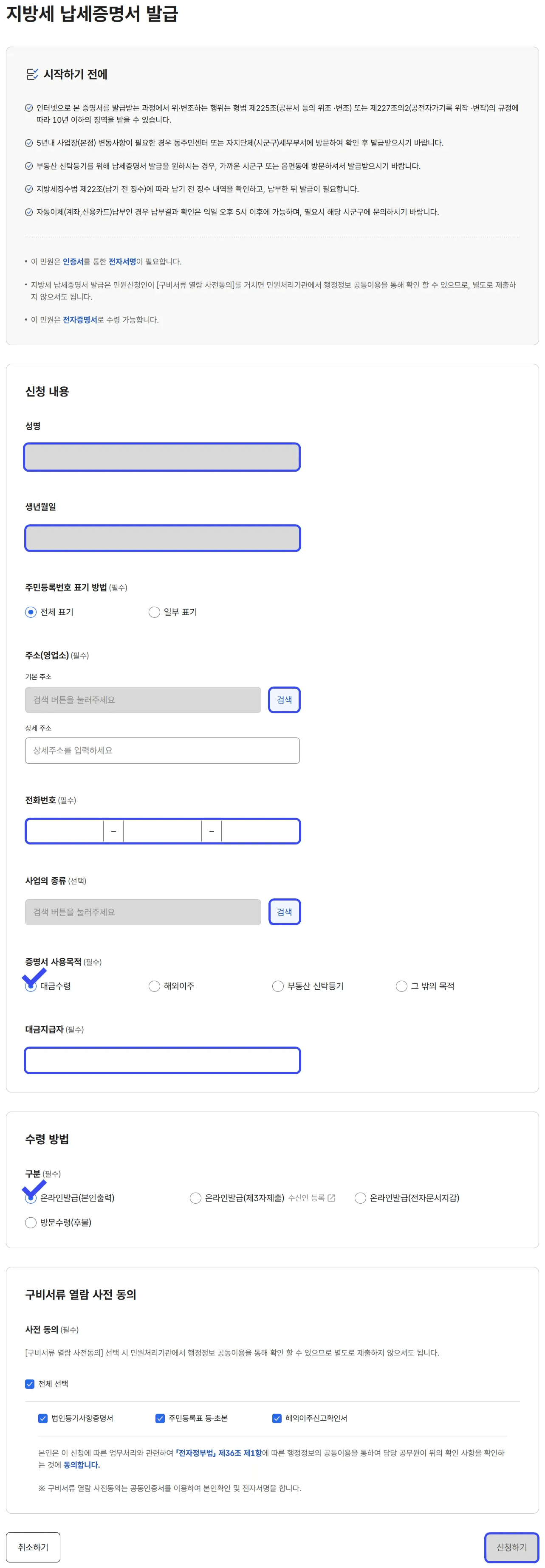 지방세 납세증명서 세부 항목 작성 방법
