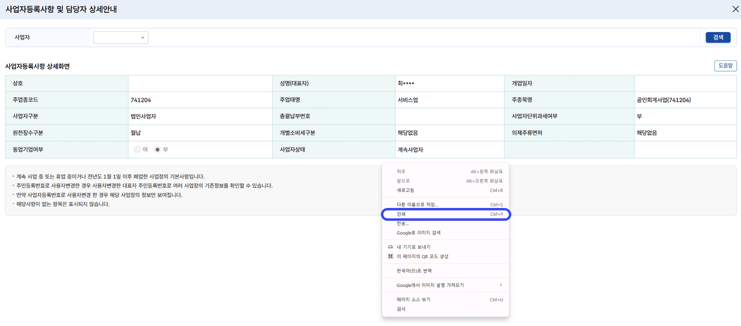 실무에서는 상세 정보(사업자번호, 상호, 업태·종목, 업종코드 등)가 나온 홈택스 조회 화면을 출력한 뒤, 여백에 회사 직인이나 명판을 찍은 서류를 관행적으로 '주업종코드 확인서'라고 부릅니다.
