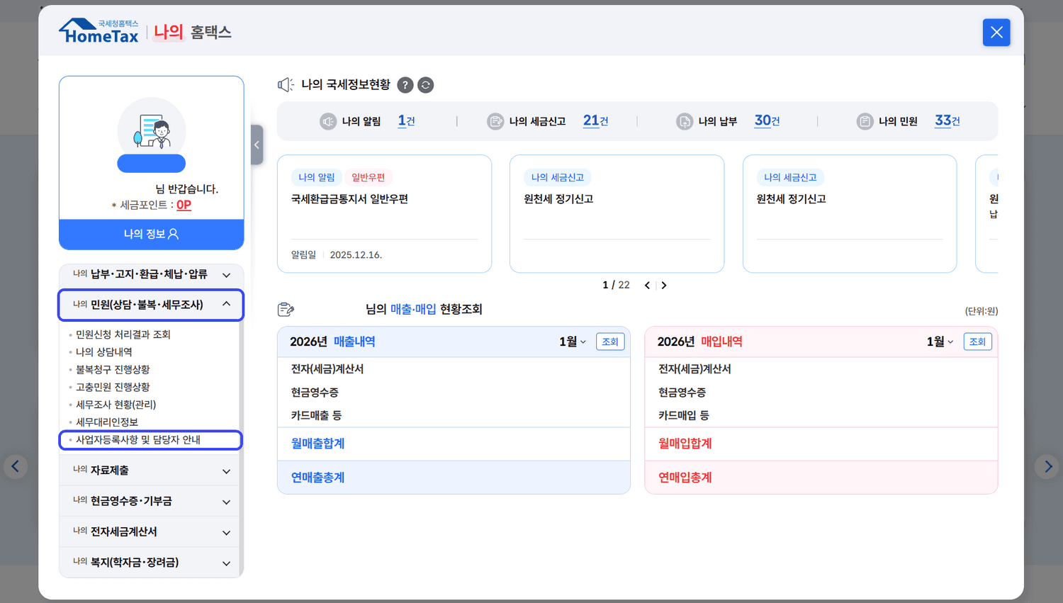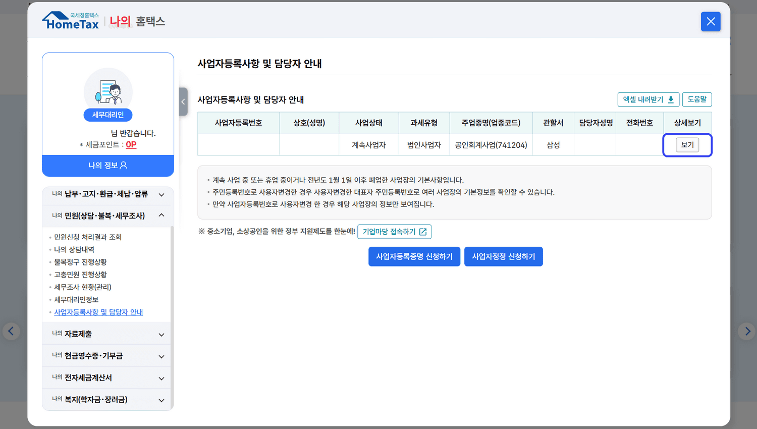 메뉴 경로: [My홈택스] > [나의 민원(상담·불복·세무조사)] > [사업자등록사항 및 담당자 안내]