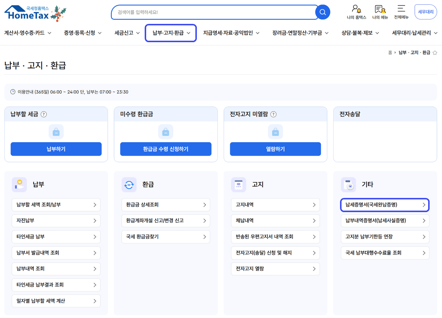 상단 메뉴에서 아래 경로로 이동합니다. 검색창에 '납세증명서'를 입력해도 됩니다.