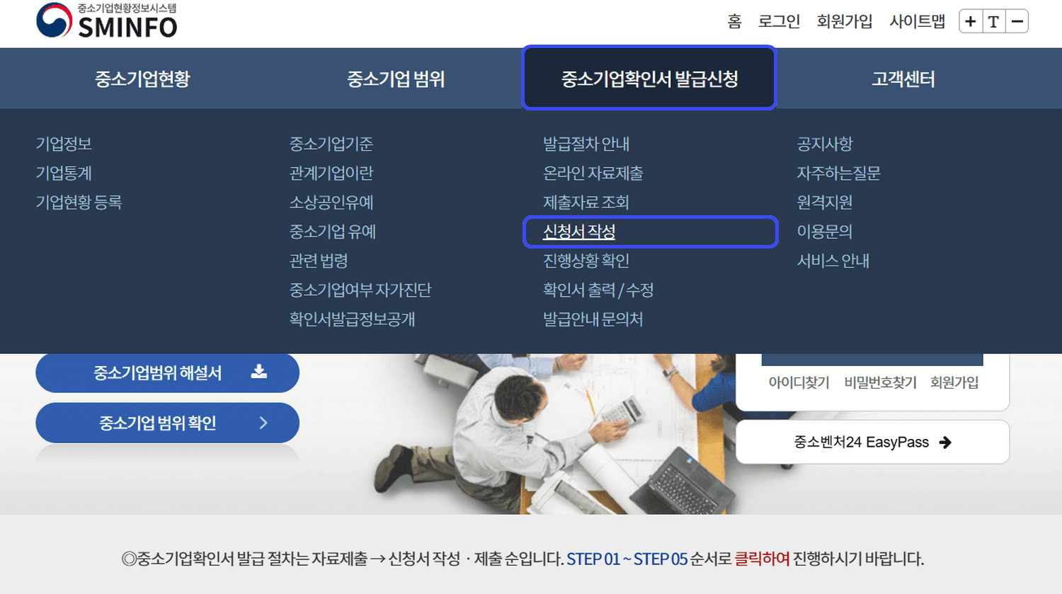 중소기업확인서는 중소기업현황정보시스템에서 온라인으로 발급 가능하며, 크게 '자료 제출'과 '신청서 작성' 두 단계로 나뉩니다.