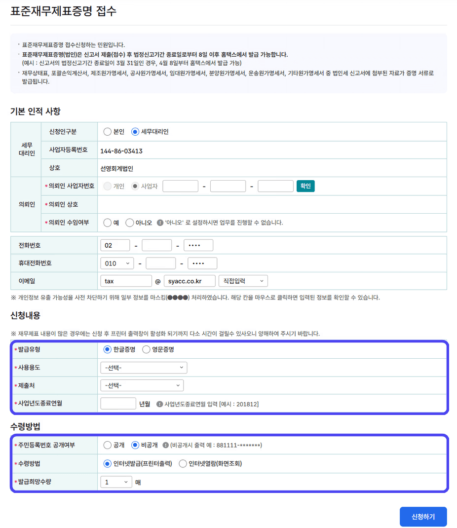 발급 조건 : 법인세를 신고한 연도만 발급할 수 있어요. 즉, 몇 년간 신고하지 않았다면 해당 기간의 표준재무제표는 발급이 불가능해요.