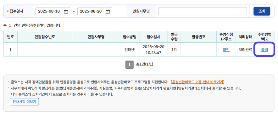 내용 입력 후 신청하기 버튼을 클릭하면 자동으로 민원증명 처리결과 조회 페이지로 이동해요.